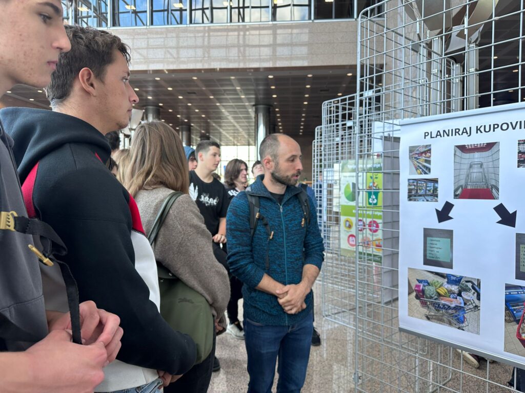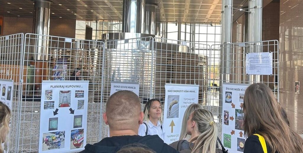 A popodne smo podijeljeni u tri grupe razgledali izložene učeničke radove iz kojih smo naučili kako zbrinuti viškove hrane, smanjiti proizvodnju otpada te od ostataka pripremiti kreativan obrok poput palačinki od prezrelih banana ili brownieja od čokolade i kave.