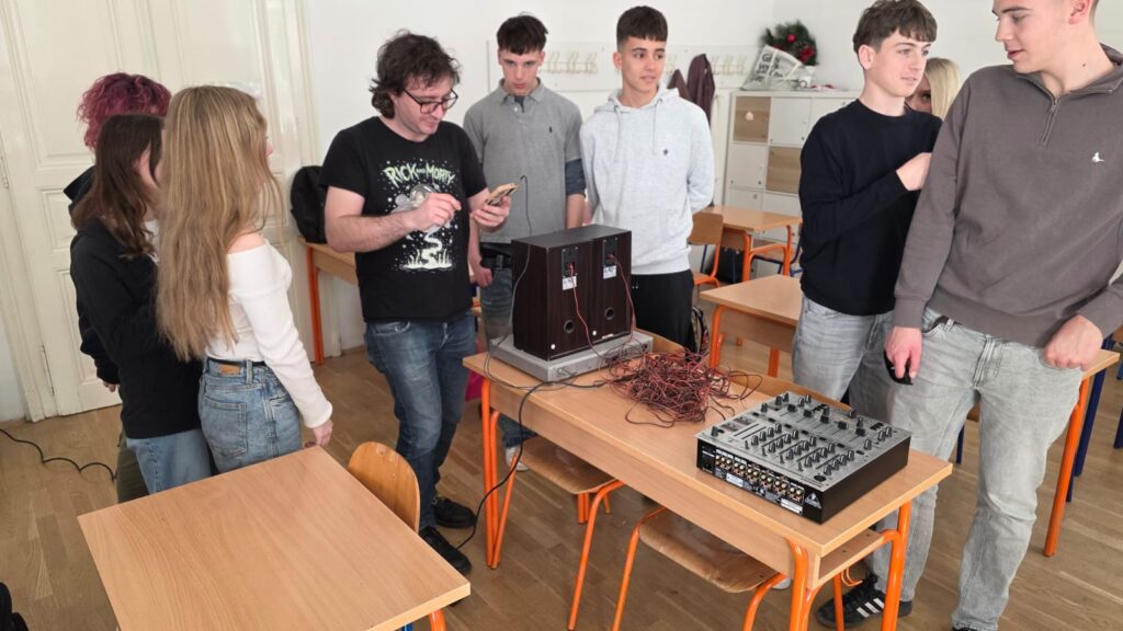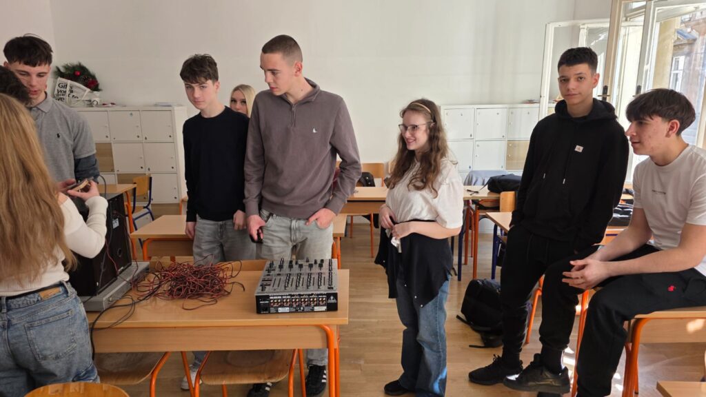 Glazbena je radionica ove godine posvećena nastanku i povijesti elektronske muzike, pa su se oni okružili odgovarajućom aparaturom, a školu obukli u repetitivne ritmove sintetske glazbe.