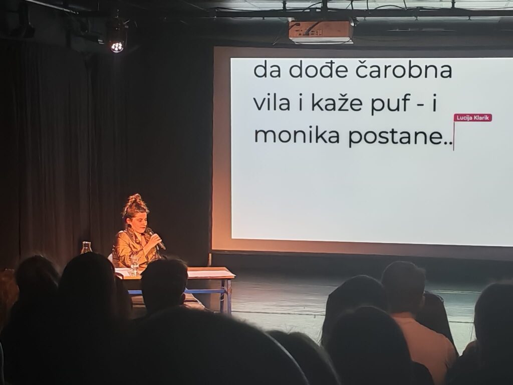 Dramaturginja Lucija Klarić u svojoj se predstavi obračunava s ulaskom u tridesete, a u tome joj je pomogla suvremena pjesnikinja i dramatičarka Monika Herceg koja je odgovarajući na pitanja i usmjeravajući predstavu u željenom smjeru postavljala pitanja i našim učenicima o odrastanju i o procesu starenja.