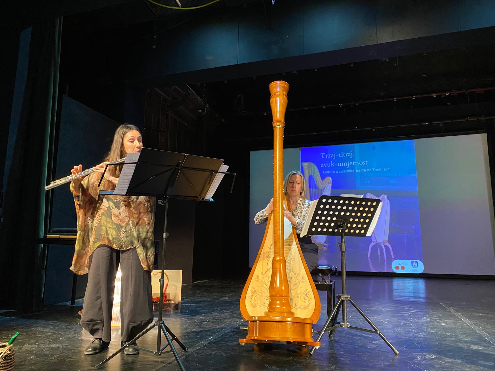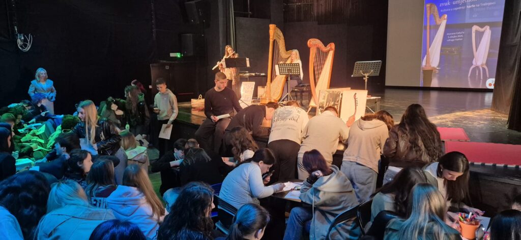 Učenici su na izložbi Trzaj – titraj, zvuk – umjetnosti u Centru za Kulturu Trešnjevka, uz vodstvo profesorice flaute Lidije Ljubičić i profesorice harfe Tajane Vukelić Pejić, naučili mnogo o povijesti tih instrumenata, njihovom razvoju kroz različita razdoblja te o brojnim podvrstama harfe i flaute.