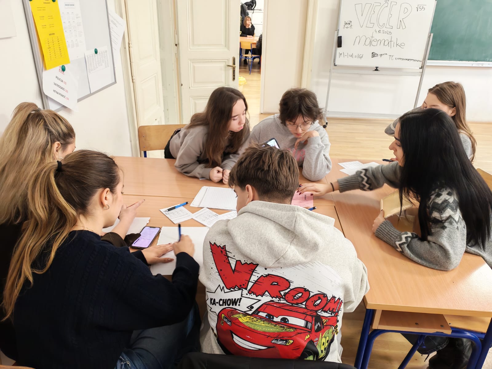 Naši vrijedni profesori matematike – koje su učenici ovdje ovjekovječili na bijeloj ploči – opremili su ove godine čak 20 postaja sa raznovrsnim zadacima i pridobili 20 volontera među učenicima koji su onda vodili svoje školske kolege prema uspješnom rješavanju zadataka.